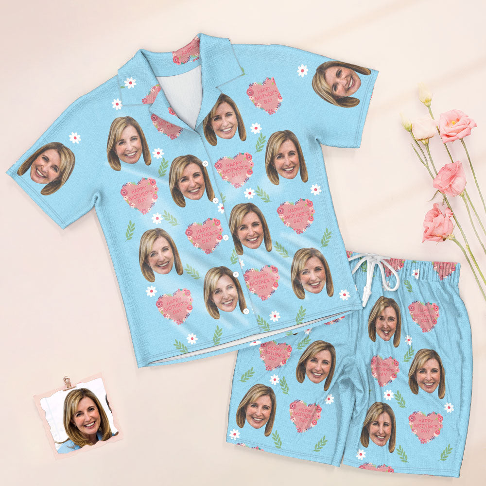 Custom Face Short Sleeved Pajamas Personalised Photo Sleepwear Women Summer Blue Pajamas Happy Mother's Day Gift