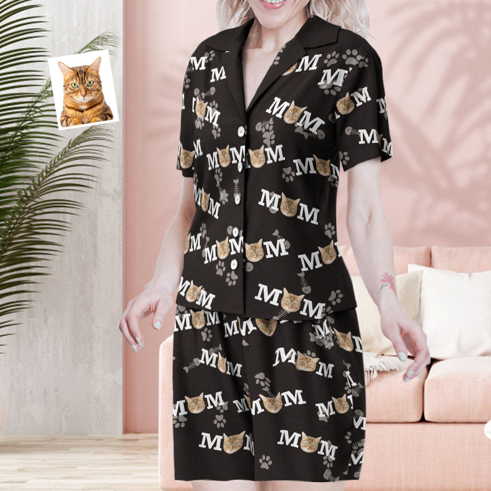 Custom Face Short Sleeved Pajamas Personalised Photo Sleepwear Women Summer Black Pajamas Cat Mom