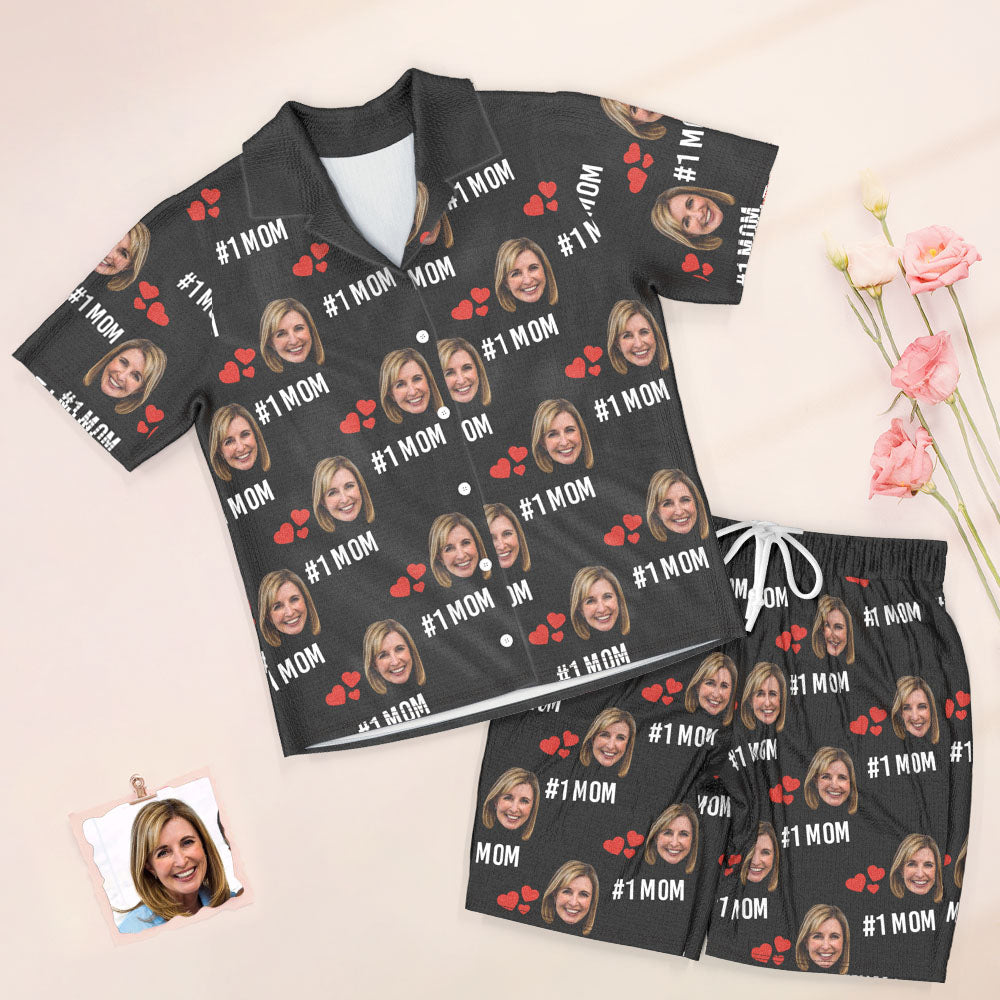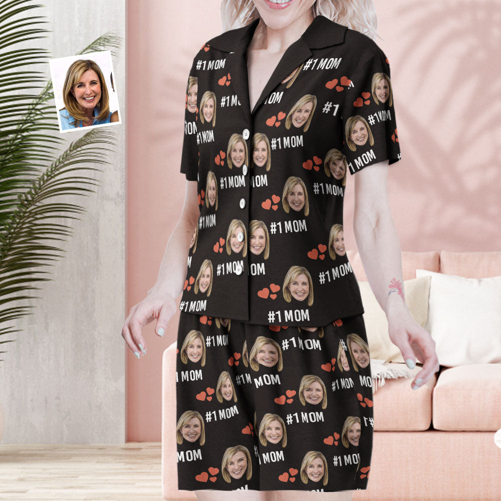 Custom Face Short Sleeved Pajamas Personalised Photo Love Sleepwear Women Summer Black Pajamas #1 MOM