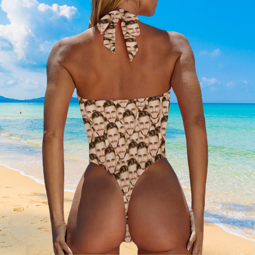 Personalized Face Women's Halter High Cut One-Piece Swimsuit Unique Gift for Her