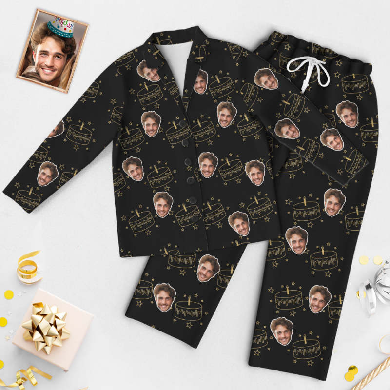 Custom Face Birthday Pajamas Personalised Photo Party Sleepwear Women Men Black Pajama Set Birthday Cake