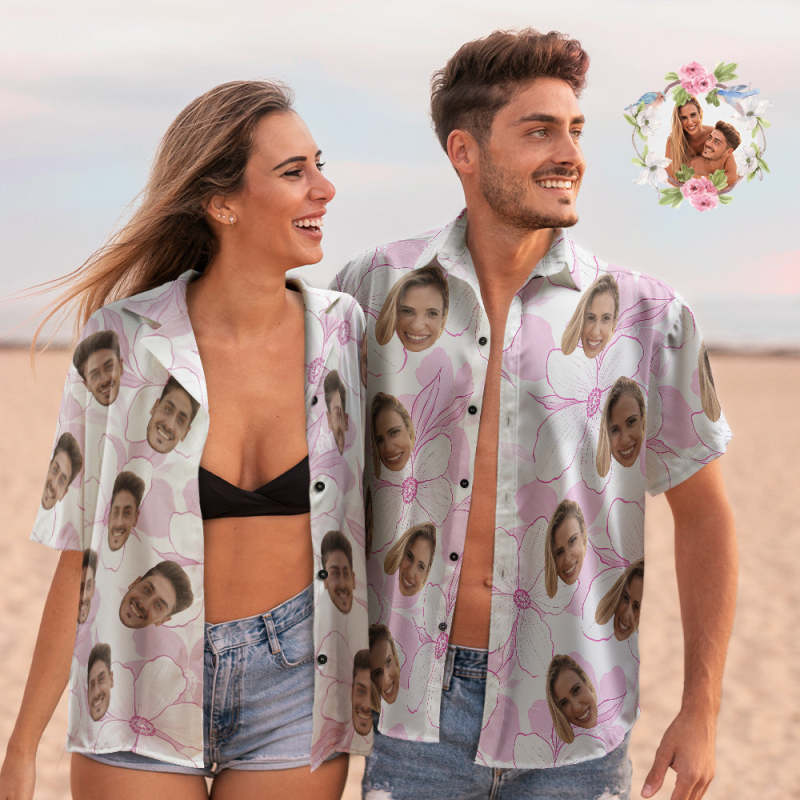 Custom Face Couple Matching Hawaiian Shirts Pink Flower Valentine's Day Anniversary Gift