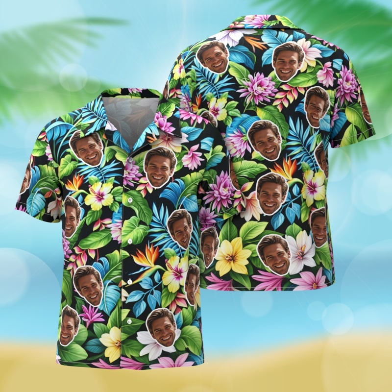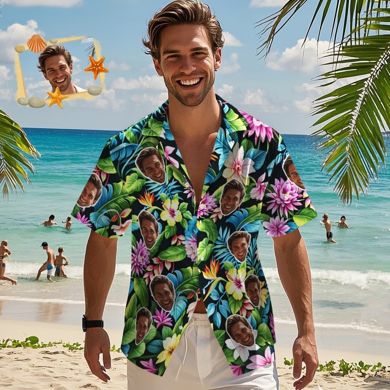 Custom Face Hawaiian Shirts Floral and Leaf Patterned Shirts Perfect for Summer Vacation Clothes Gifts for Men