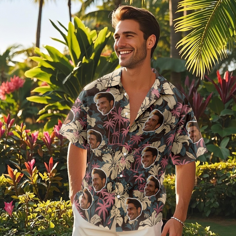 Custom Face Hawaiian Shirts Floral and Pink coconut tree Patterned Shirts Perfect for Summer Vacation Clothes Gifts for Men