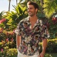 This Hawaiian shirt features a print, button closure and short sleeves.
