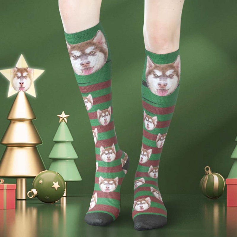 Custom Face Knee High Socks Personalised Pet's Photo Socks Christmas Gifts - Green