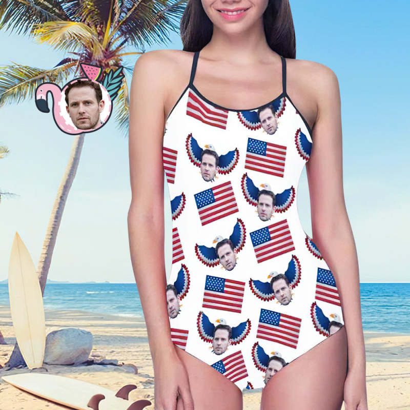 Custom Face Swimwear Women's Photo Slip One Piece Swimsuit- USA Flag With Bald Eagle