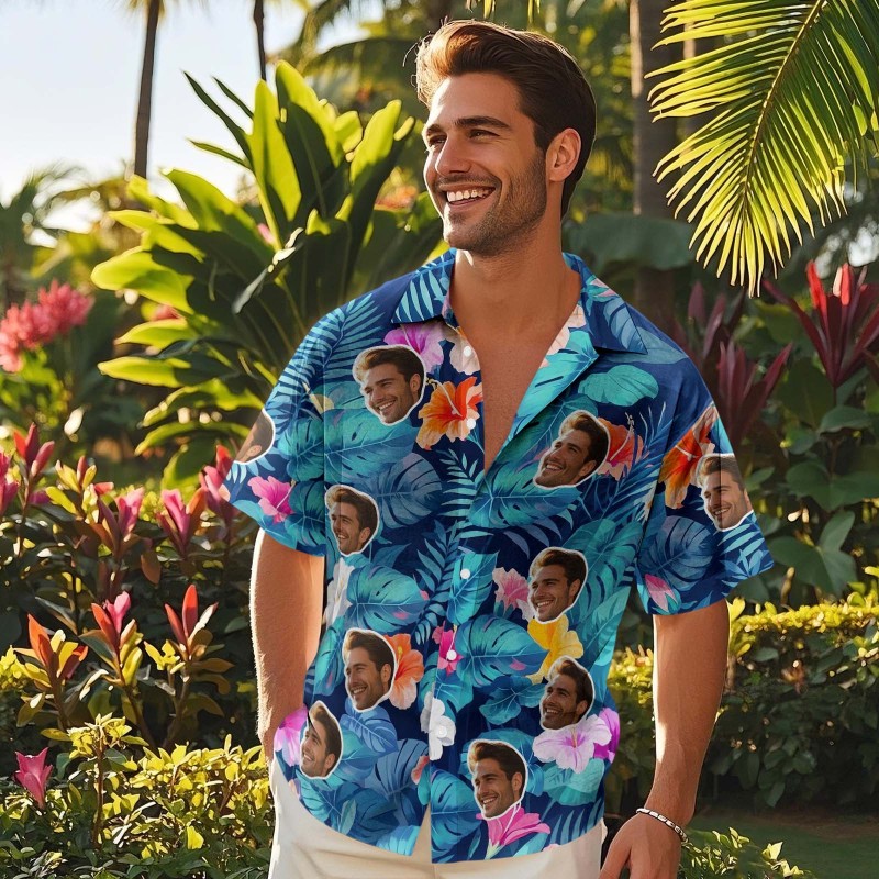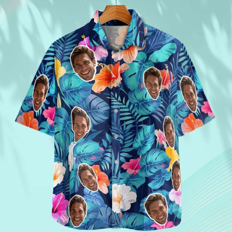 Custom Hawaiian Shirt Blue leaf Pattern Colorful Custom Face Hawaiian Shirt