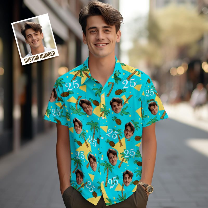 Custom Multi-color Face and Numbers Hawaiian Shirt Coconut Tree and Pineapple Gift for Men