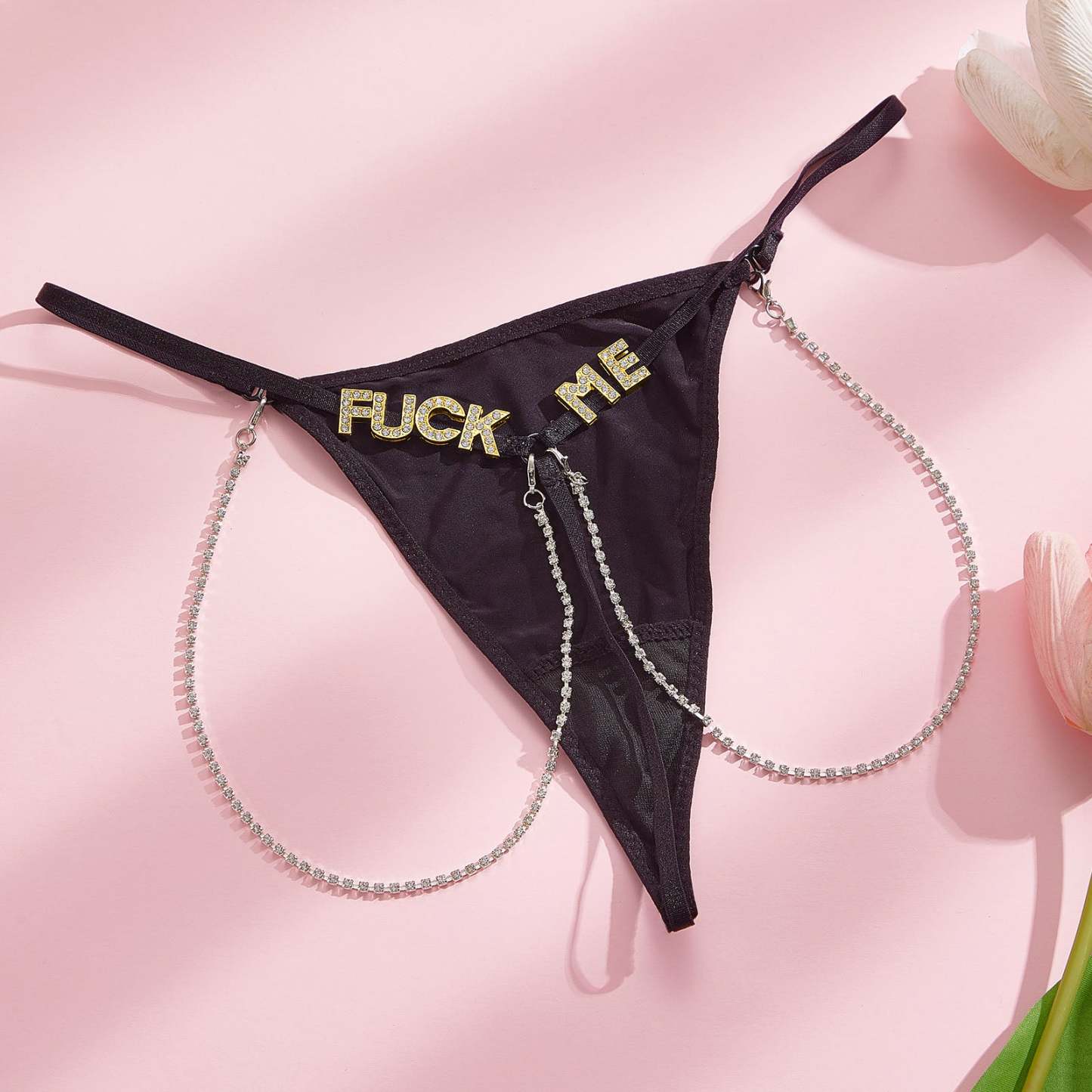 Metallic Chain Detail: Adorned with metallic chains that add a touch of sophistication and glamour, enhancing the allure of the thong.