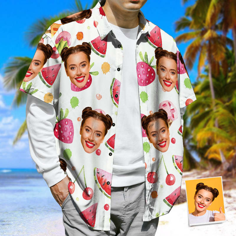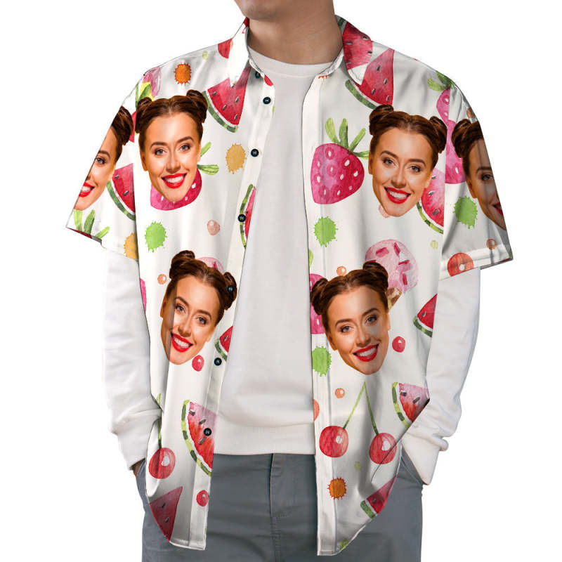 Face Print Hawaiian Shirt Watermelon & Strawberries & Cherries Casual Beach Shirt